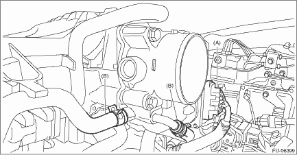 8. Disconnect the preheater hose (B) from the throttle body.