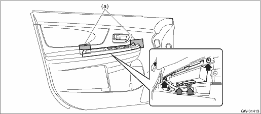 (1) Insert a sheet of protective paper (a) between panel - power window main switch and trim panel - front door.