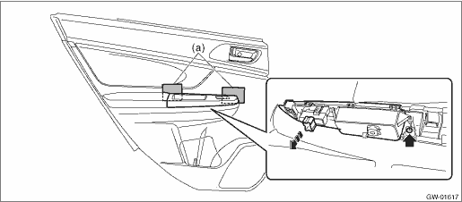 (1) Insert a sheet of protective paper (a) between panel - power window sub switch rear and trim panel - rear door.