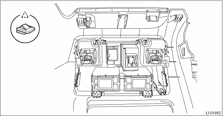 WIPER AND WASHER SYSTEMS > Rear WasherREMOVAL1. Disconnect the ground cable from battery. NOTE">2. Remove the trim panel - rear gate UPR.(1) Remove the claws on the trim edge.(2) Release the claws in the center of trim, and remove the trim panel - rear gate UPR.3. Remove the roof spoiler ...