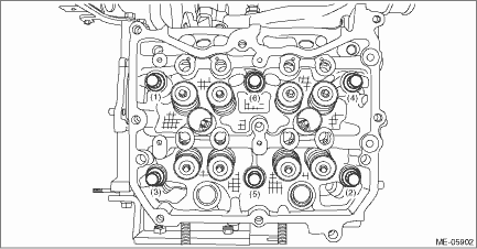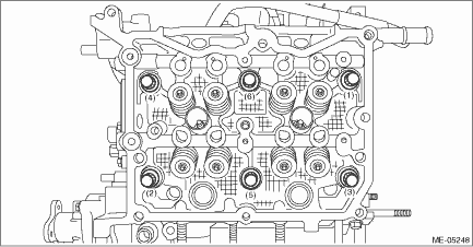 9. Loosen the bolts holding the cylinder head LH equally, a little at a time in numerical sequence as shown in the figure, and while leaving the cylinder head bolts (1) and (4) engaged by three or four threads, remove the other cylinder head bolts.