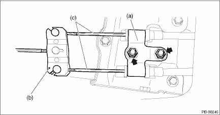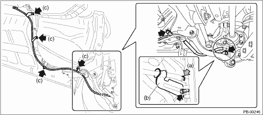 15. Remove the cable clamp (c) from the rear floor, and remove the cable assembly - parking brake.