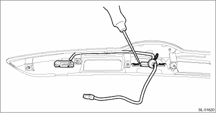 4. Release the locks at both ends of the button - opener rear gate by pushing them with a flat tip screwdriver, remove the button - opener rear gate and remove the integrated harness.