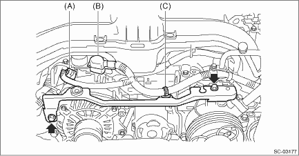 4. Disconnect the connector (A) and terminal (B) from the generator, and remove the clip (C).