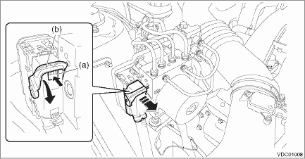 (2) Push the lock button (a), pull down the lock lever (b) and disconnect the VDCCM&H/U connector.