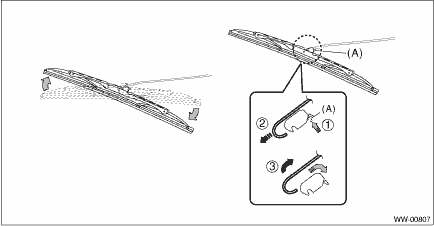 Turn the blade assembly - rear wiper in the direction of arrow (A) and remove it from the arm assembly - rear wiper.