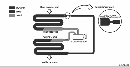 The evaporator turns into a low temperature condition when the mist refrigerant that was turned into a low temperature, low pressure condition at the expansion valve is vaporized in large quantity in the evaporator. Passing air flow through the low temperature evaporator emits cold air.