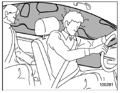 In a moderate to severe side impact collision, the SRS curtain airbag on the impacted side of the vehicle deploys between the occupant and the side window and supplements the seatbelt by reducing the impact on the occupant's head.