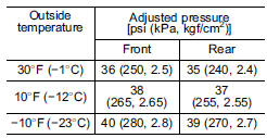 If you adjust the tire pressures in a warm garage and will then drive the vehicle in cold outside air, the resulting drop in tire pressures may cause the low tire pressure warning light to illuminate. To avoid this problem when adjusting the tire pressures in a warm garage, inflate the tires to pressures higher than those shown on the tire placard. Specifically, inflate them by an extra 1 psi (6.9 kPa, 0.07 kgf/cm2) for every difference of 108F (5.68C) between the temperature in the garage and the temperature outside. By way of example, the following table shows the required tire pressures that correspond to various outside temperatures when the temperature in the garage is 608F (15.68C).